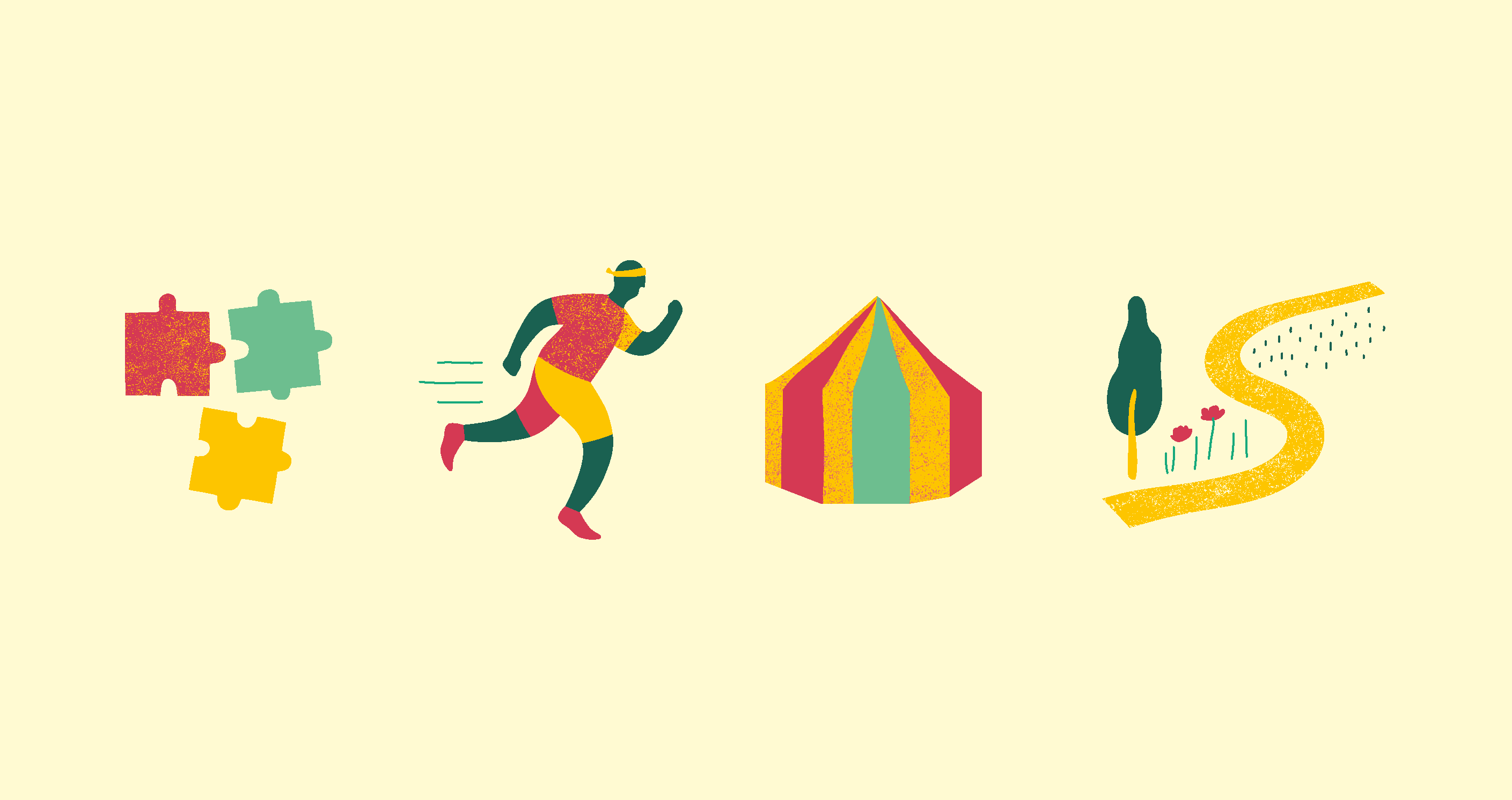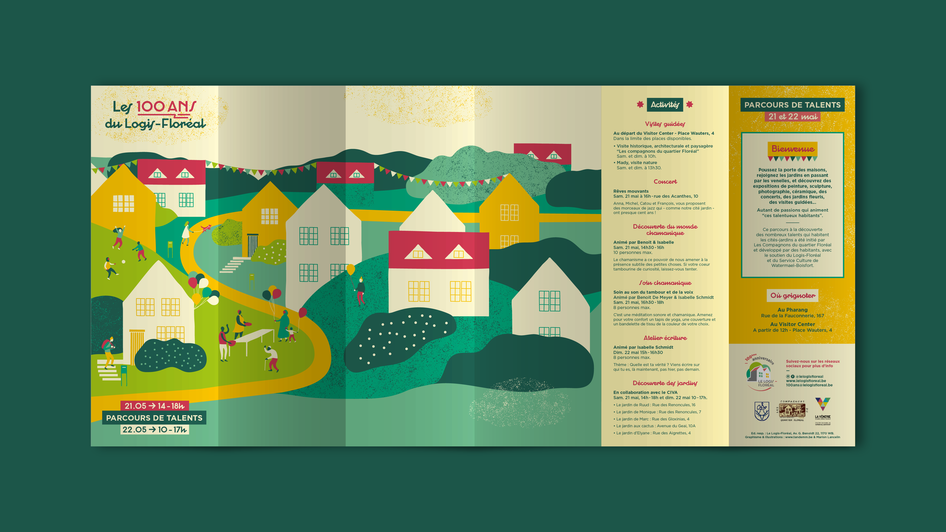 Projet de visuel illustré, iconographie, dépliant et flyer pour le parcours d’artiste organisé par le Logis Floréal à l’occasion de leur 100 ans.