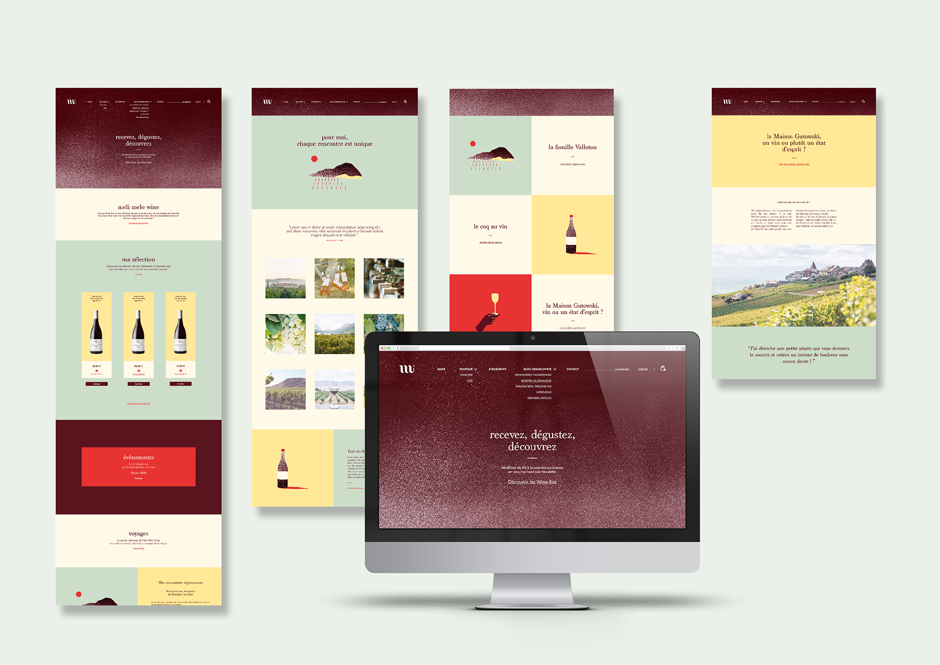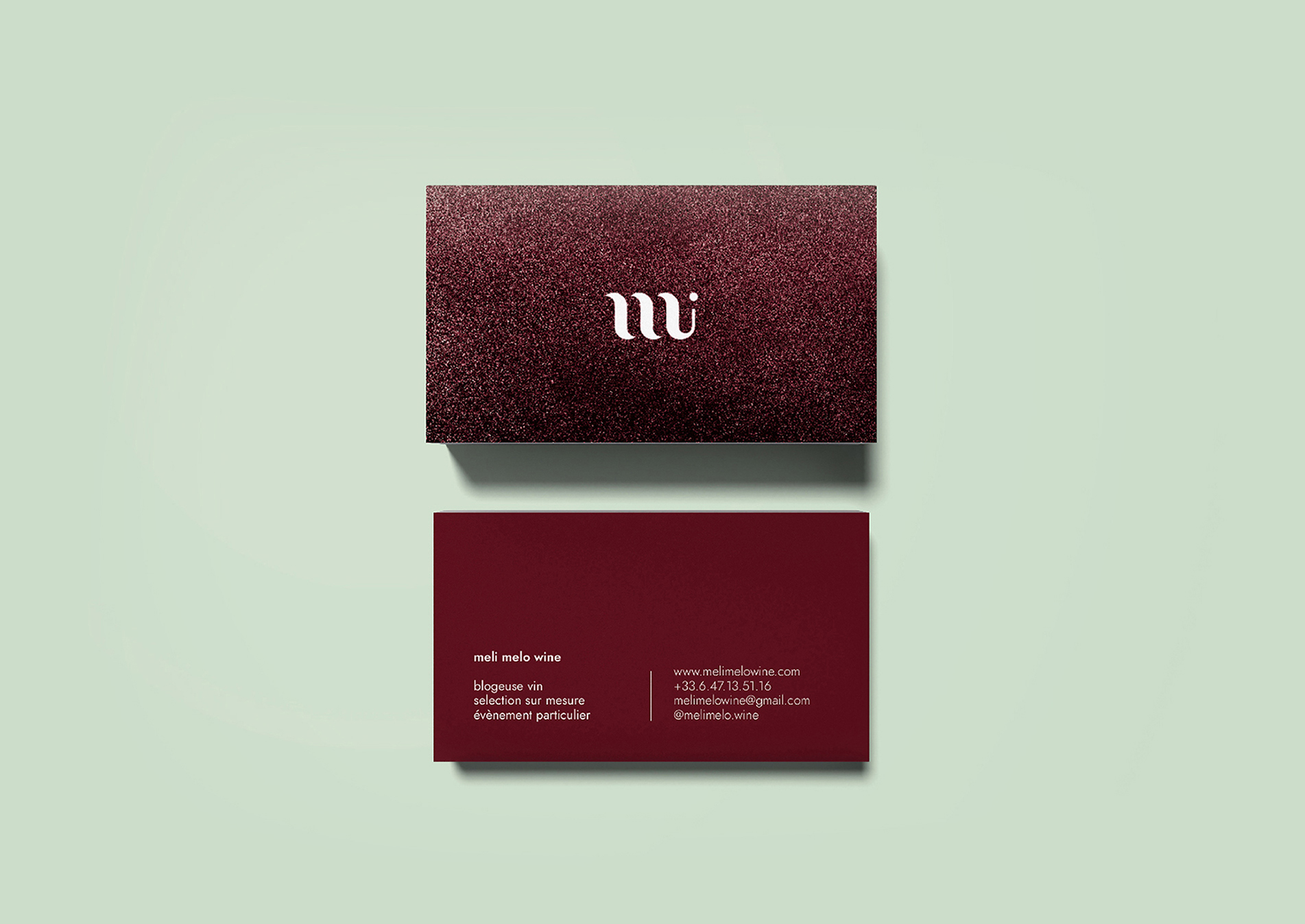 L’identité de Meli melo wine a été conçue à partir de l’image poétique du vin. L’univers graphique à été exploité autour de l’image du moût, cette matière préliminaire de raisin broyé pour en extraire le jus. La texture granuleuse est omniprésente et constitue la base de l’identité.